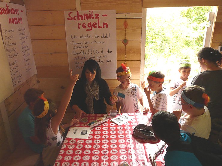 In diesem Rahmen wurde uns die Aufgabe gestellt ein Projekt für Kinder zu planen. Da der zum Stadtjugendring gehörige Abenteuerspielplatz ein Tipi gesponsert bekam, stand unser Thema der Projektwoche schnell fest. Das Motto lautete: Auf den Spuren der Indianer. Viele verschiedene Angebote, wie z.B. das Herstellen von Pfeil und Bogen, eine Schnipseljagd und vieles mehr wurden geplant und durchgeführt.