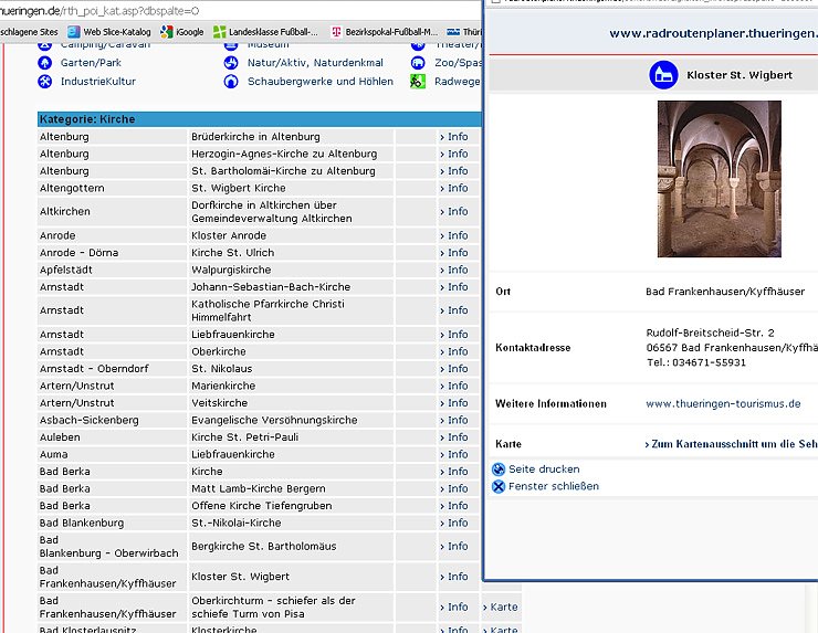 Der Gute, der nicht namentlich genannt sein möchte machte Klick, um sich wichtige Kirchen im Radtourenplaner anzeigen zu lassen. Dabei fiel ihm auf, in Bad Frankenhausen gibt es ein Kloster St. Wigbert. Es soll sich in der Rudolf-Breitscheid-Str. 2 - 06567 Bad Frankenhausen/Kyffhäuser befinden. Zu mindest öffnet sich dieses Pop-Up-Fenster, wenn man den Link Info Kirchen Thüringen benutzt, und zeigt das an.