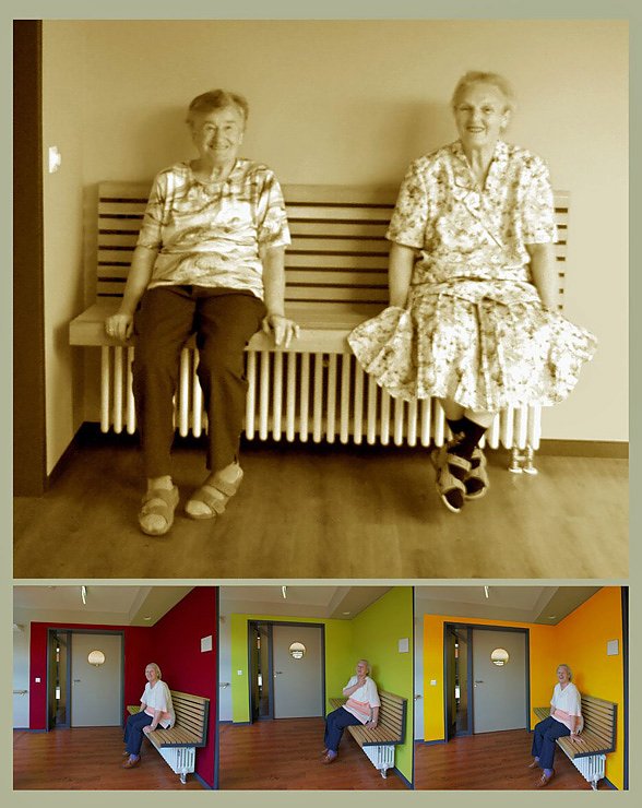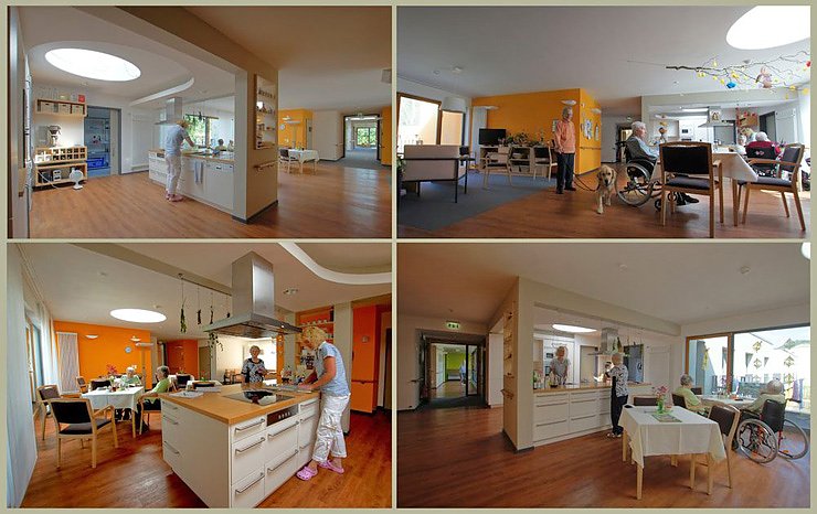 Bei der Betreuung von Demenzkranken ist beispielsweise zu beachten, dass die Patienten sich im Innenbereich und auch in geschützten Außenräumen ausreichend bewegen können. Durch eine geeignete bauliche Struktur können so Angstzustände und Fluchttendenzen vermindert werden. Unter dem Motto Das Leben ist bunt unterstützen starke Farbkontraste (s. Foto in der Anlage) die Orientierung und Wahrnehmungsfähigkeit der Bewohner. Die Beleuchtung auch der Innenräume durch viel Tageslicht senkt die Betriebskosten und fördert vor allem das Wohlbefinden und die geistigen Fähigkeiten der Patienten. Auch wird das ‚Leben ins Haus’ geholt – Pflanzen, Teiche und Fische wurden in die Gestaltung der Innenräume der Siedlung einbezogen. Übersichtliche Blickbeziehungen zwischen Menschen und Räumen und kurze Wege für die Mitarbeiter helfen, dass das Personal Zeit zur Pflege hat und nicht zum Laufen.
