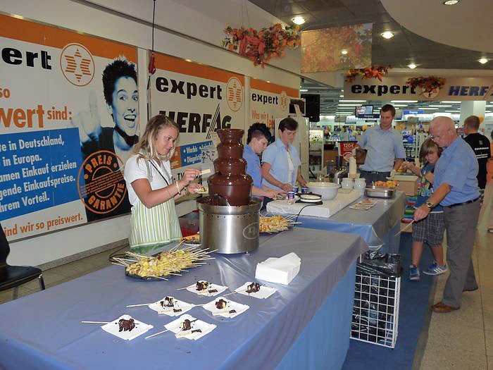 Neben an bei Herfag gab es einen Schokobrunnen, bei dem Obstspieße mit einer Schokoglasur versehen wurden. Daneben gab es frischen Fruchsaft aus einer frischen Pressung.