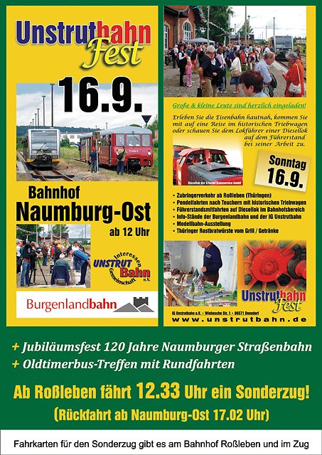 Autor: khhAm 16.9. findet es auf dem Gelände des Naumburger Ostbahnhofes statt; im Anhang dazu der aktuelle Flyer. Leider können wir auch in diesem Jahr (wie bereits 2009) das Fest nicht in Roßleben abhalten, da die Deutsche Regionaleisenbahn (DRE) als Streckenbetreiberin nur Triebwagenverkehr zulässt (Lokomotiven dürfen aufgrund der maroden Feldwegbrücke an der Landesgrenze nicht fahren), so der Verein gegenüber kn.