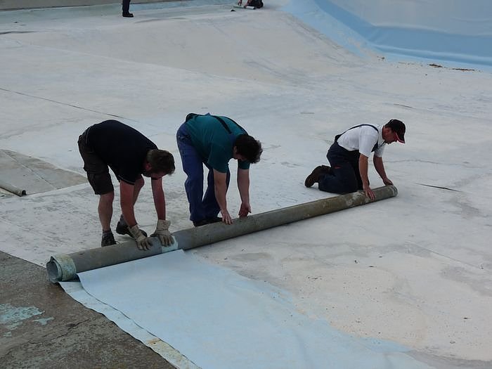 Beim Herausnehmen der Folie zeigte sich der Vereinsvorsitzende Detlef Wiegel überrascht, dass der Beton offensichtlich weniger gelitten hatte, als befürchtet. Überraschend schnell gelang es die Folie aus dem Becken zu bekommen. Kurz noch 11:30 war die Folie komplett draußen.