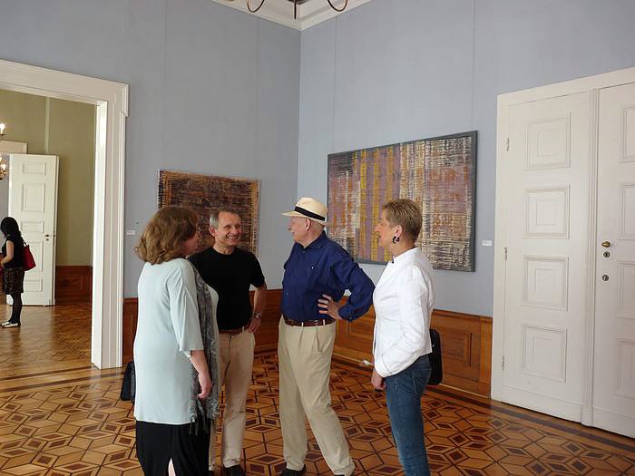 Der in Lichtenstein in Sachsen geborene Künstler Ulrich Reimkasten, hier vor seinem Werk "Regen", war nach seinen Studien in Schneeberg und an der Burg Giebichenstein in Halle/Saale in den 80er Jahren freischaffend und als Meisterschüler an der Akademie der Künste der DDR tätig, bevor er 1995 zum Professor für Malerei und Textile Künste an seiner alten Studienstätte Burg Giebichenstein berufen wurde. 2010 gründete er das Institut für Textile Künste SEPIA.