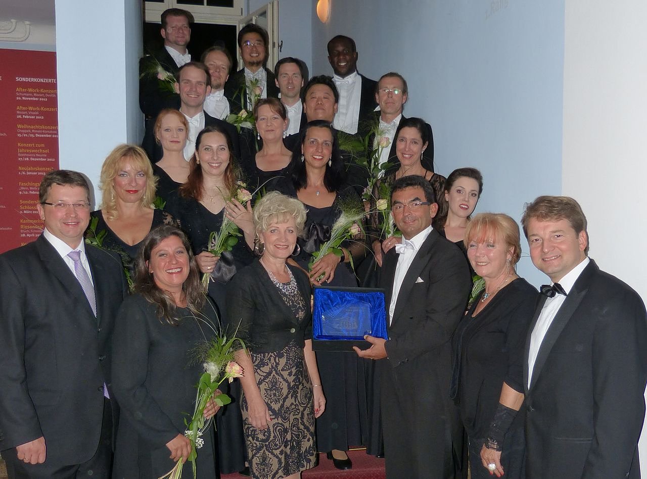 Der Opernchor des Theaters Nordhausen erhielt den Nordhäuser Theaterpreis 2012. Vorne von links: Thomas Seeber, Mitglied des Vorstandes der Kreissparkasse Nordhausen, Chordirektorin Elena Pierini, Landrätin Birgit Keller, Chorvorstand Dimitar Radev, Waltraud Hebestreit, Vorstandsmitglied des Fördervereins Theater Nordhausen, Intendant Lars Tietje