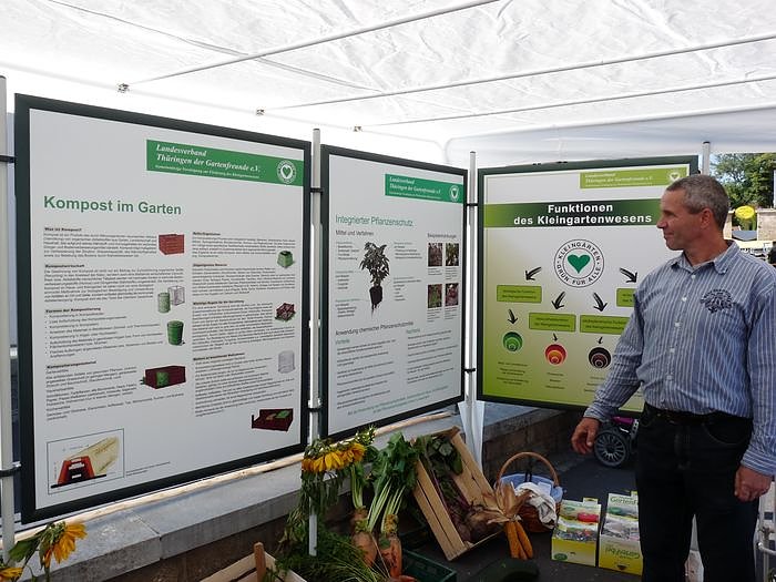 Mit der Schautafel Sondershausen und seine Gärten konnte man sich informieren, wo sich welche Kleingartenanlagen befinden. Zuwachs können die Kleingärtner immer gebrauchen, denn der Leerstand in den Anlagen ist nicht gerade gering. So hat kn erfahren, dass zum Beispiel Gärten in den Kleingartenanlagen "Glückauf", "Hammatal" und "Zufriedenheit" zu vergeben sind.