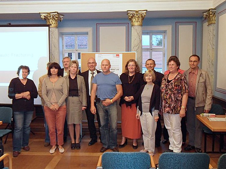 Zu einer Informationsveranstaltung zum Thema Fracking, dem unkonventionellen Erdgasabbau aus unteren Gesteinsschichten, hatten die Sondershäuser Landtagsabgeordnete Dorothea Marx (SPD) und ihr Kollege Frank Weber (SPD) aus Sömmerda ins Sondershäuser Rathaus eingeladen. Ab Ende der Veranstaltung waren sich alle Teilnehmer dieser Versammlung, unter ihnen auch die Landrätin des Kyffhäuserkreises Antje Hochwind, die Sondershäuser Vizebürgermeisterin Cornelia Kraffzick und die Landessprecherin von Bündnis 90/Grüne Babette Pfefferlein, darüber einig, eine Bürgerinitiative "Kein Fracking in Mittel- und Nordthüringen" zu gründen.