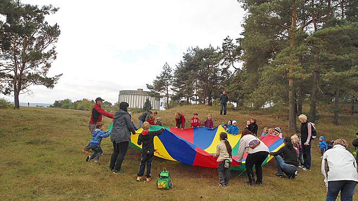 Auf der Wiese konnte jeder nach Herzenslust eine Pause einlegen: entweder mit anregenden Gesprächen oder beim Spiel mit dem Schwungtuch bzw. beim Tauziehen. Die tollen Spiele organisierte das Elternbeiratsmitglied Andreas Kirchner und begeisterte damit nicht nur die Kinder.
