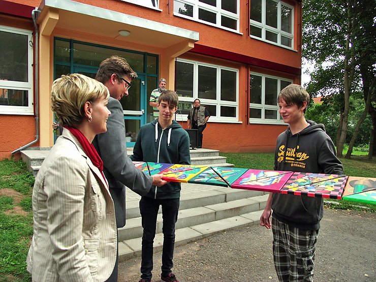 Dank für die langjährige Unterstützung: Die Schüler Oliver Freiboth (von rechts) und Lukas Koch überreichen den WAGO-Vertretern Thomas Heimann und Kathrin Schenke das im Unterricht gestaltete Kunstwerk.