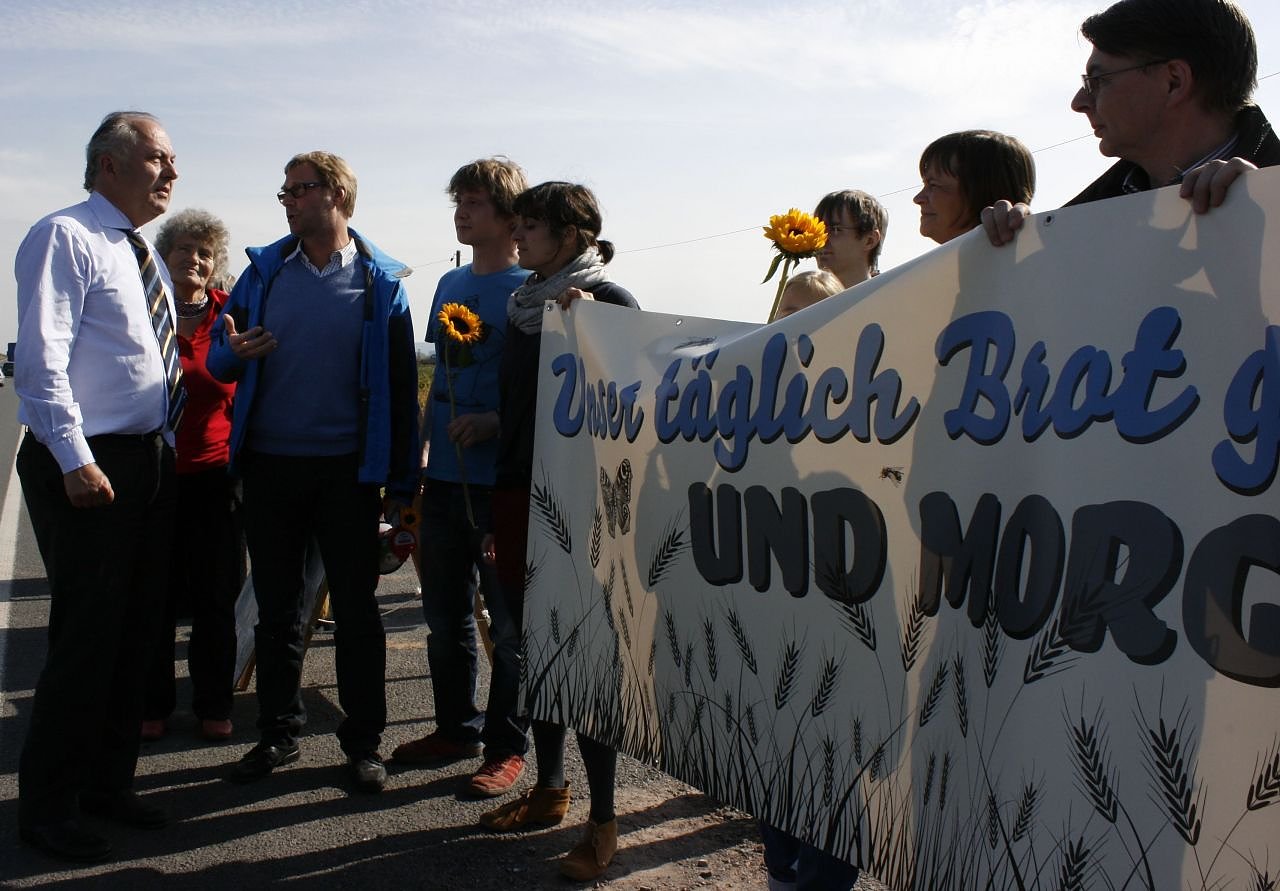 Unter dem Motto Unser täglich Brot gib uns heute. Und morgen? versammelten sich die Menschen um erneut ein Zeichen gegen die Erschließung des 100 ha großen Industriegebiets zu setzen.