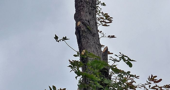Selbst der Baum, dessen einzige Krone so einigermaßen verschont wurde, zeigt von unten her keine toten Zonen. Wie kommt man da zu der Erkenntnis, die Bäume müssen weg?