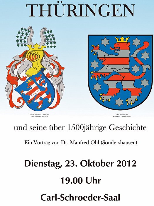 Am Dienstag, dem 23. Oktober 2012 führt der Vortrag um 19.00 Uhr im Carl-Schroeder-Saal durch die Historie von über 1500 Jahren Thüringen.