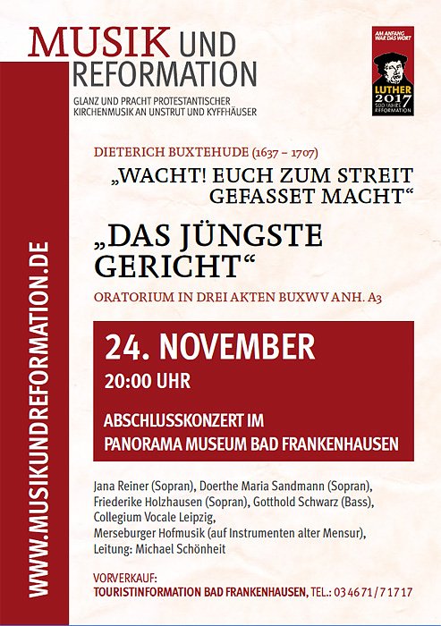 Am 24. November 2012 schließt das Panorama Museum Bad Frankenhausen bereits um 16.00 Uhr. Grund dafür sind umfangreiche Vorbereitungen für das an diesem Abend um 20.00 Uhr beginnende Konzert Das Jüngste Gericht von Friedrich Buxtehude, das den Abschluss der Reihe Musik und Reformation – Glanz und Pracht protestantischer Kirchenmusik an Unstrut und Kyffhäuser bildet.