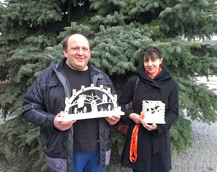 Bereits 2 Stunden vor Eröffnung klopften erste Kaufinteressenten an die Rathaustür, um bereits ein solches Souvenir zu erwerben. Gudrun Liebscher und Maik Holzapfel aus dem Südharz (siehe Bild) waren somit die ersten Käufer des Frankenhisser Schwibbogens & Windlichtes und absolut happy. Innerhalb der ersten 2 Tage wurden bereits über 20 Bögen und 21 Windlichter verkauft. Hierzu hat insb. die Werbetrommel des Bürgermeisters auf Facebook beigetragen, wobei die Gäste teils von weiter her (u.a. Sangerhausen, Nordhausen und dem Harz) kamen.
