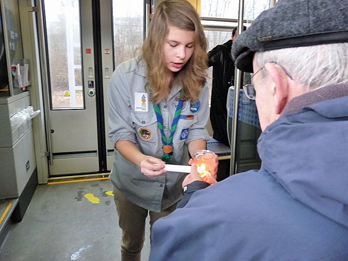 Pfadfinder und andere junge Helfer hatten es in einer Feierstunde in Leinefelde (Friedenslicht auf dem Weg ins Land) die Weitergabe vorbereitet. Danach wurde das Friedenslicht per Zug auf ganz Thüringen verteilt.