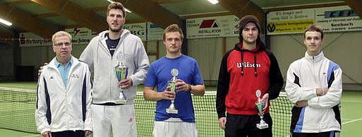 Organisator Klaus Stöber (l.) vom Tenniscenter Erbstromtal beglückwünscht die vier Erstplatzierten (2. v. l.) Georg Matschke, Manuel Paulick, Marc Szelig, Alexander Masur, die sich nach Platzierungen aufstellten. Foto: Sascha Willms