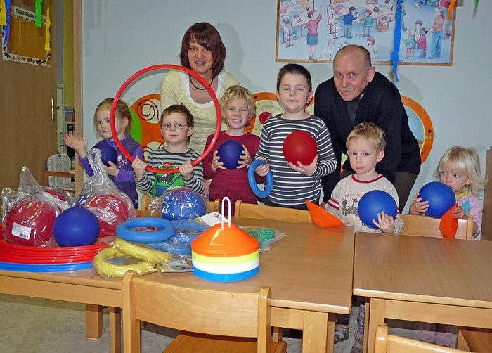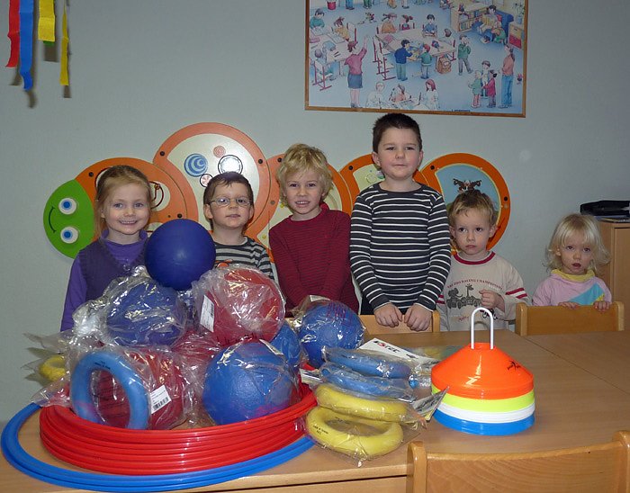 Natürlich freute sich die Leiterin der Kita, Andrea Hotze, über die Spende und mit den Kindern wurden gleich einige Bälle, Reifen und Wurfringe ausgepackt und später ausprobiert.