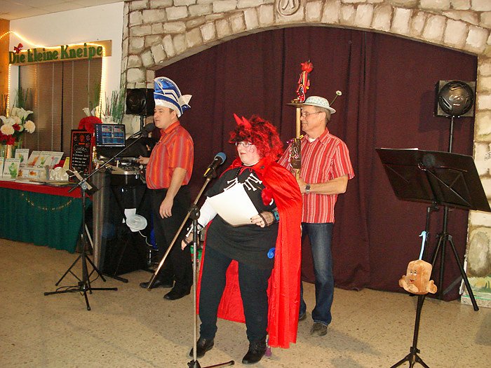 Nach diesem Auftritt übernahmen Sir Henry und sein Assistent Bernd das Zepter und brachten den Saal zum Kochen. Die Anwesenden wurden gleich mit einbezogen und schunkelten zu "Es gibt kein Bier auf Hawaii". Danach gab es eine Modenschau mit einem universell einsetzbarem Teil (lange Männerunterhose) und es war sehr interessant, wozu die so alles taugte z. Bsp. als nordische Haube, als Stola. Schleier, Badehose, Bolerojacke, Kellnerschürze und wenn es sein muss dann auch als Männerunterhose - es blieb kein Auge trocken.
