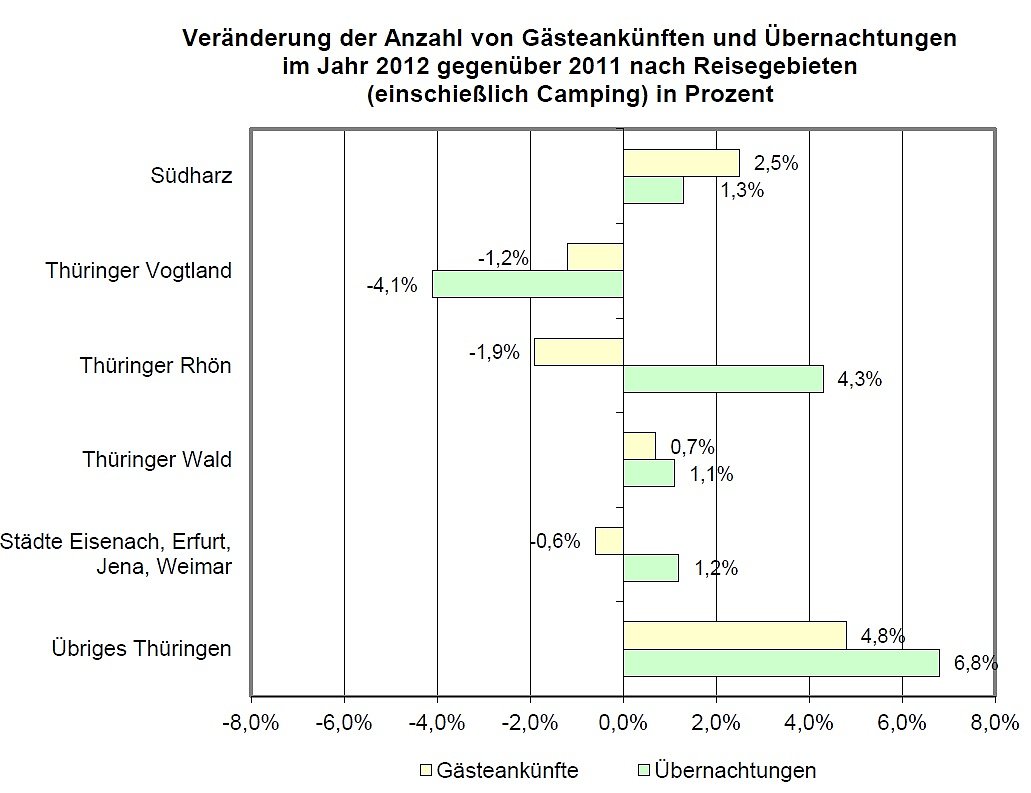 Die Hälfte der sechs Thüringer Reisegebiete konnte im Jahr 2012 sowohl steigende Übernachtungszahlen verbuchen als auch mehr Gäste begrüßen. Deutliche Zuwächse verzeichnete insbesondere das Reisegebiet Übriges Thüringen (Übernachtungen: +6,8 Prozent, Gästeankünfte: +4,8 Prozent). Auch der Thüringer Wald konnte gegenüber dem Vorjahr zulegen. Hier stieg die Zahl der Übernachtungen um 1,1 Prozent auf 4,4 Millionen und die Zahl der Gästeankünfte um 0,7 Prozent auf 1,4 Millionen.