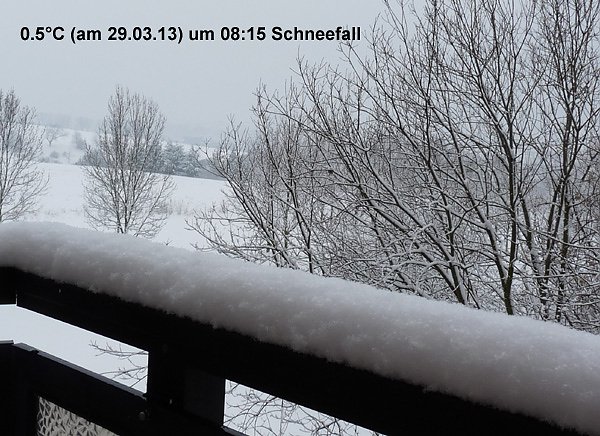 Wenn man bedenkt, auf so einer Balkonbrüstung kann sich nicht beliebig viel Schnee halten, dann kann man erahnen, was da die Nacht vom Himmel fiel, zumal der Balkon sogar zum Teil überdacht ist! Und aktuell schneit es immer noch.