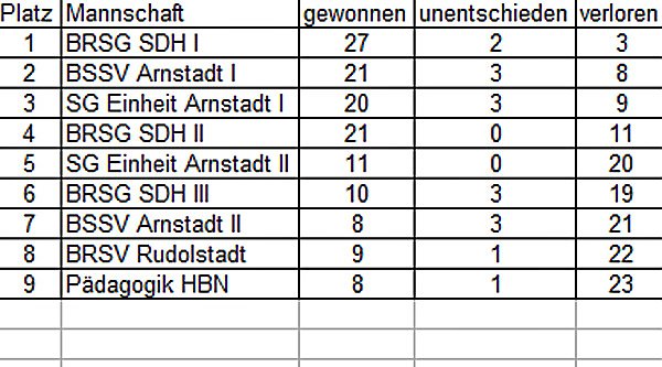 Autor: khhDer 1. Spieltag war am 23.02.13 bei der SG Einheit Arnstadt. Der BRSV Rudolstadt richtete am 02.03.13 den 2. Spieltag aus. Vor heimischer Kulisse fand am 16.03.13 der 3. Spieltag bei der BRSG Kyffhäuser in Sondershausen statt. Den 4. und somit vorletzten Spieltag veranstaltete der BSSV Arnstadt am 06.04.13. Zum Meisterschaftsfinale am 20.04.13 geht es dann zu Pädagogik Hildburghausen.