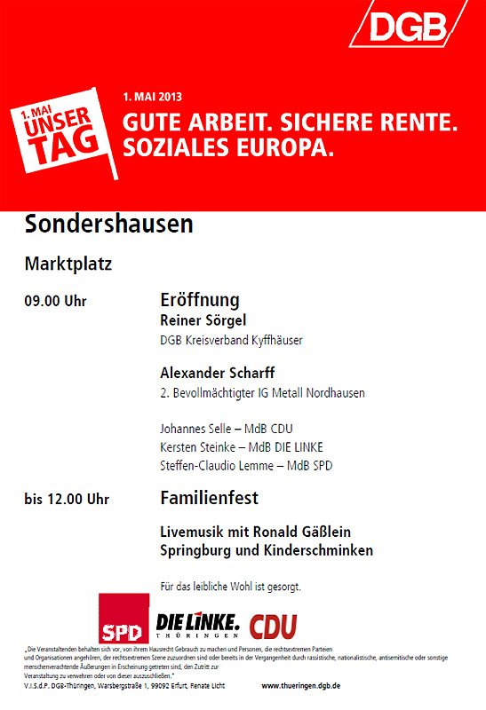 2013 ist kein Jahr wie jedes andere. Am 2. mai vor achtzig Jahren wurde die freie deutsche Gewerkschaftsbewegung durch die Nationalsozialisten zerschlagen. Gewerkschafterinnen und Gewerkschafter wurden von den Nazis verhaftet, verschleppt, gefoltert und ermordet. Unsere Geschichte verpflichtet uns zum Handeln gegen Rassismus, Antisemitismus und Intoleranz. Der 1. Mai ist unser Fest der Solidarität und kein Ort für Nazis.
