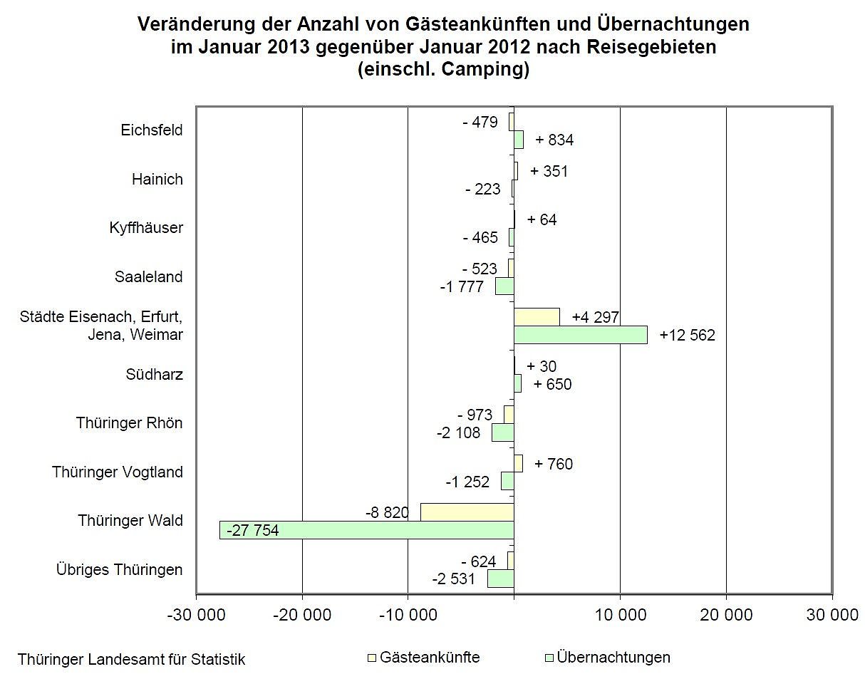 Spürbare Verluste waren hingegen in den Reisegebieten Saaleland, Thüringer Rhön, Thüringer Wald und Übriges Thüringen zu verzeichnen, wobei insbesondere die Rückgänge im Thüringer Wald (-28.000 Übernachtungen und -9.000 Gästeankünfte) einen prägenden Einfluss auf das Thüringer Gesamtergebnis im Januar 2013 hatten.