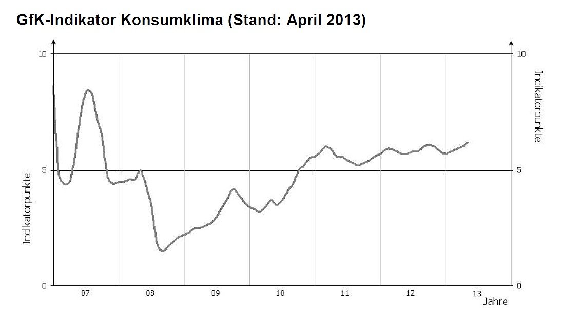 Die Gründe für diese überaus gute Konsumneigung sind nach wie vordie stabile Beschäftigungssituation sowie die guten Einkommenszuwächse in Verbindung mit einer niedrigen Inflationsrate stützen.. Hinzu kommt, dass durch die Ereignisse in Zypern das Vertrauen in die Sicherheit der eigenen Sparanlagen doch nachhaltig gelitten hat. Das hat unter anderem dazu geführt, dass die Sparneigung im April auf einen neuen historischen Tiefststand gefallen ist. Die Verunsicherung gegenüber den Finanzmärkten stimuliert die Konsumenten, ihre finanziellen Mittel in werthaltige Anschaffungen zu investieren anstatt sie zur Bank zu tragen, zumal die zur Zeit historisch niedrigen Zinsen nicht einmal die Inflation kompensieren.