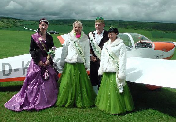Diese Hoheiten wollten heute mal ihr "Reich besichtigen". So quetschen sich Fliederkönigin Isabelle I. und die beiden Hofdamen des Laubkönigs von Udersleben, Jörg I. auf die Rückbank der Wilga, während vorn der Laubkönig neben dem Piloten, Vereinvorsitzenden Horst Dreischärf", "residierte. Nach dem Flug sagten alle Hoheiten, man wäre mit den Liegenschaften zufrieden.