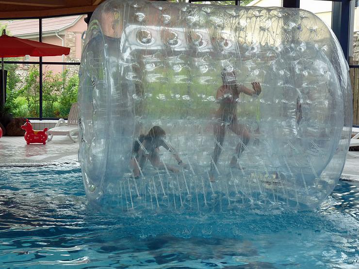 Als besonderes Highlight wird den Kindern hier eine Riesenlaufrolle (ca. 2,50 groß), mit welcher sie über das Wasser laufen können, geboten. Badespaß pur ist garantiert! Auf der Liegewiese draußen war bei dem Regen nicht viel los, dafür war es besonders am Nachmittag so richtig voll im Warmen.