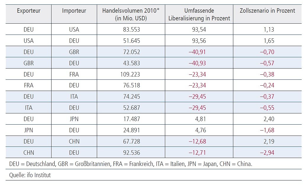 Bei ihren Simulationsrechnungen betrachteten die Wissenschaftler zwei Szenarien. Eine ausschließliche Abschaffung der Zölle (Szenario 1) würde kaum für positive Wachstumseffekte sorgen. Würde man dagegen die Handelshemmnisse umfassend abbauen (Szenario 2), käme es zu den oben berechneten Effekten. Zu diesen Handelshemmnissen gehören zollfremde Maßnahmen wie Qualitätsstandards, Verpackungs-und Bezeichnungsvorschriften oder Herkunftsangaben sowie technische oder rechtliche Anforderungen an importierte Produkte. Auch die Förderung der eigenen Exporte durch Steuervorteile oder finanzielle Förderungen gehören hierzu.