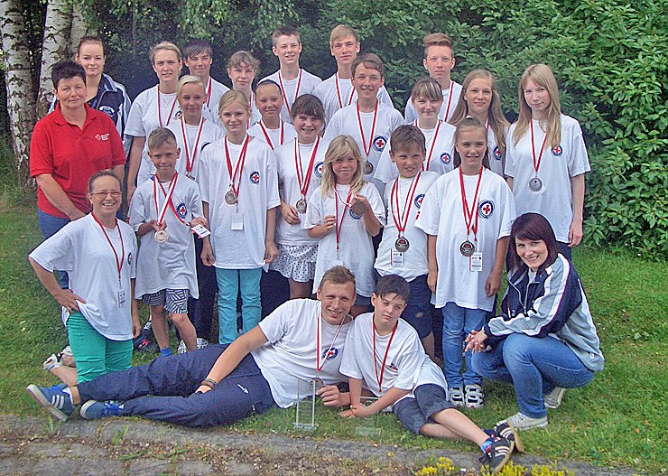 Realistische Unfallsituationen, wie Schockbehandlung, Verbrennungen, Kopfplatzwunde, ausgeschlagener Zahn und Verstauchungen gehörten zum Teil des Wettbewerbes. Hier war vor allem Teamarbeit, Ruhe und Konzentration der Kinderund Jugendlichen gefragt. Mit Bravour wurden diese Aufgaben gemeistert und die Gruppenbetreuer, Anett Raßbach, Marie-Louise Paetzold, Madlen Habeck und Christin Girschele konnten ihren Schützlingen ein großes Lob aussprechen.
