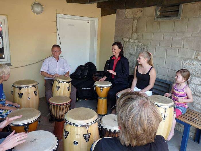 Am MusikMobil konnten die Kinder und Jugendlichen mit Klaus Hagedorn (Nordhausen) verschiedenen Percussion-Instrumente kennenlernen und sich in die Welt der geheimnisvollen Rhythmen entführen lassen. Auch Landrätin Antje Hochwind kehrte zu ihren Wurzeln zurück und durfte mal kräftig zuschlagen, ohne sich über politische Gegner Gedanken zu machen.
