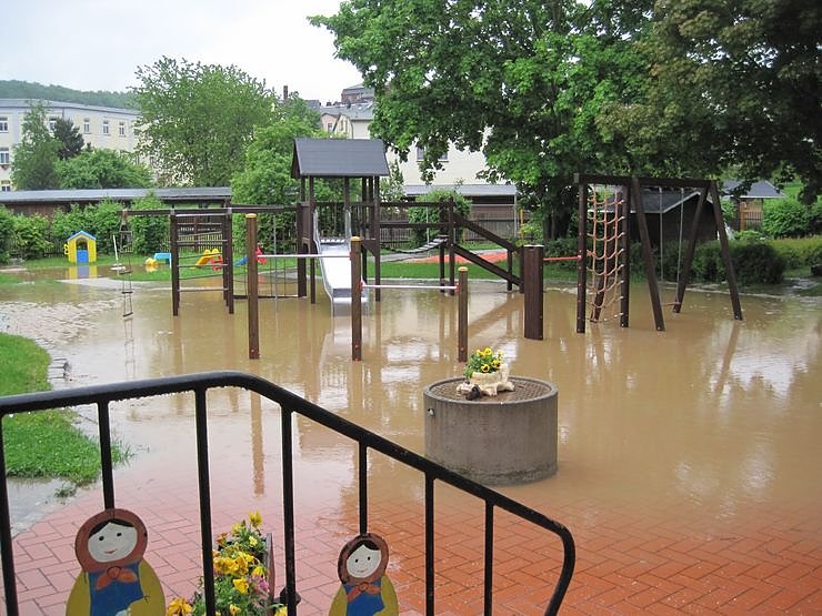 Hochwasser auf dem Spielplatz der Kita am 2. Juni