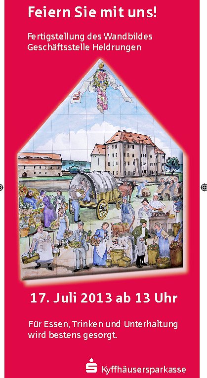 Das Wandbild am Giebel der Geschäftsstelle der Kyffhäusersparkasse in Heldrungen ist fertig gestellt. Nun wird es gemeinsam mit dem Roßlebener Maler Hans Tempel der Öffentlichkeit vorstellt, verbunden mit einem kleinen Fest,