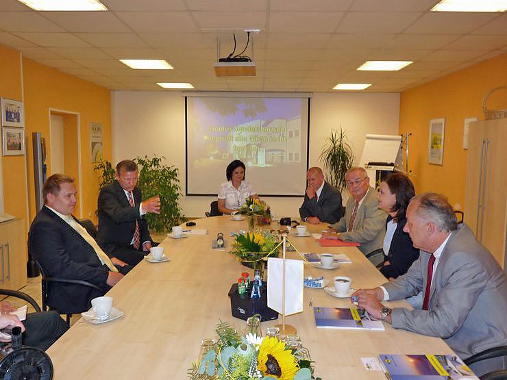 In einer Gesprächsrunde (von li. n-re.) Christoph Hörold (Prokurist), Jörg Kauschat, Susanne Teichmann vom Amt für Regionale Wirtschaftsentwicklung, Dr. Andreas Räuber und Dr. Heinz-Ulrich Thiele vom Landratsamt Kyffhäuserkreis, sowie die Landrätin des Kyffhäuserkreises Antje Hochwind und Minister Matthias Machnig.