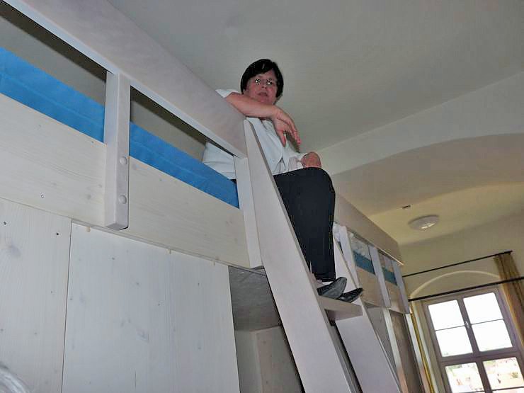 Kraft wies darauf hin, das hier im Haus sechs Vollzeitbeschäftigte sind. Mit 3,9 Millionen Städtebaufördermitteln und 1,6 Millionen Euro vom Jugendherbergsverband wird das Haus seit 2009 im vollen Betrieb saniert. Beim Rundgang ging es durch sanierte und noch nicht sanierte Räume. Kraft erinnerte an die explodierenden Baukosten und deute an, man könne noch einiege Fördermittel mehr brauchen, aber Lieberknecht ließ sich darauf nicht ein.