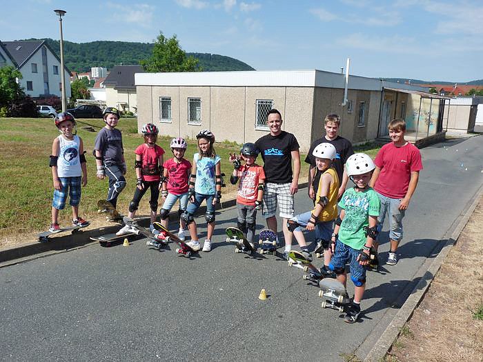 Natürlich nicht. Andy Flehmig von der Skate Arena brachte noch mehr Licht in den bereits hellen Sommertag. Man will auch mal unter veränderten Bedingungen trainieren, sagte er kn. Man sollte auch mal üben, wie sich das Board unter den Bedingungen des Asphalt fährt. Und die Straße hinter dem HOC ist da ideal, so Flehmig, denn es ist nicht zu steil und es gibt keinen Fahrzeugverkehr. Natürlich stellte man sich auch zum obligatorischen Gruppenbild.