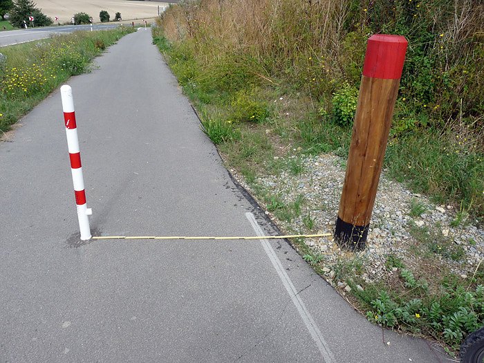 Beim Einbau der Poller wurden im Verlaufe des Weges noch schmalere Engstellen geschaffen, wie an dieser Stelle. Damit man auch die Größenverhältnisse kennt, der gesamte Radweg hat eine Breite von 240 cm.