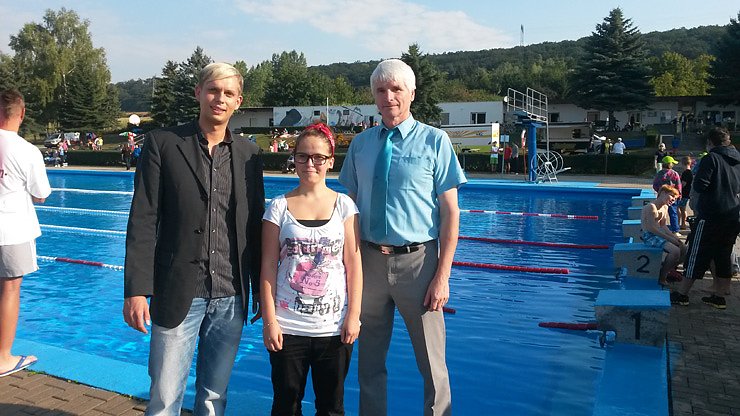 Autor: khhCDU-Bundestagsmitglied Johannes Selle unterstützt die Aktion Schwimmbades in Roßleben und hat die Patenschaft für Steffen Aschenbrenner und Jennifer Dumoulin übernommen. Johannes Selle (re.) sponsert insgesamt 70 Euro.