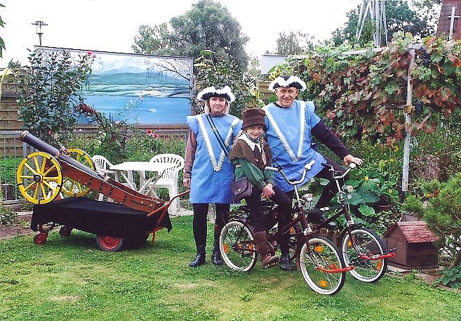 Wilfried Baus, Tochter Uta Ihling und Enkelin Annalena bauten fleißig am Kanonenmodell aus dem Jahre 1680 im Garten für ihr darstellendes Bild zum Frankenhisser Bauerherr.