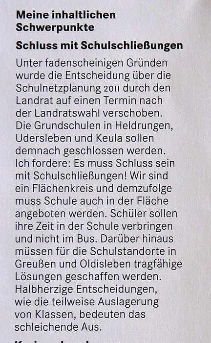 Als Landratskandidat hatte Torsten Blümel (Die Linke) klar versprochen, keine Schulschließungen ohne wenn und aber, wie sie dem Auszug aus dem Wahlflyer entnehmen können.