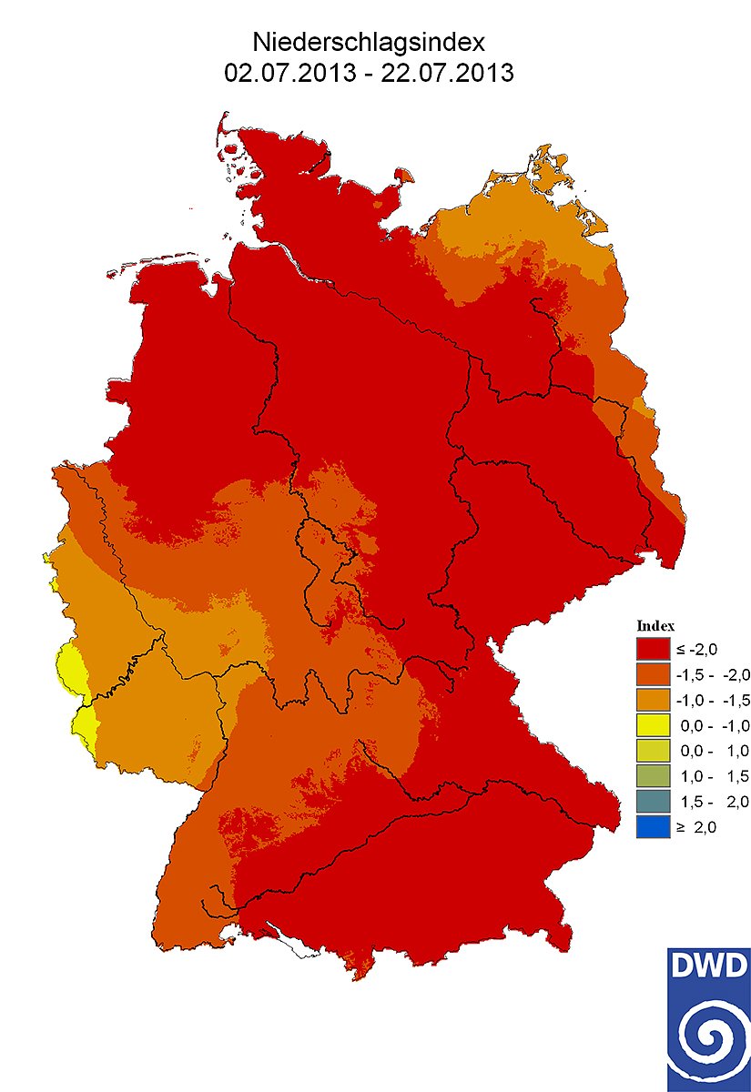 Die Abbildungen zeigen zwei Karten des international gebräuchlichen Standardized Precipitation Index (SPI). Er beschreibt die Niederschlagsanomalie in statistischer Form. Kenntlich gemacht ist die Niederschlagssituation für den extrem feuchten 21-Tage-Zeitraum vom 16. Mai – 5.Juni 2013 und die gleich lange, extrem trockene Periode vom 2. - 22. Juli 2013. Vergleichszeitraum sind die entsprechenden Tage des Mittels der Jahre 1961-1990.