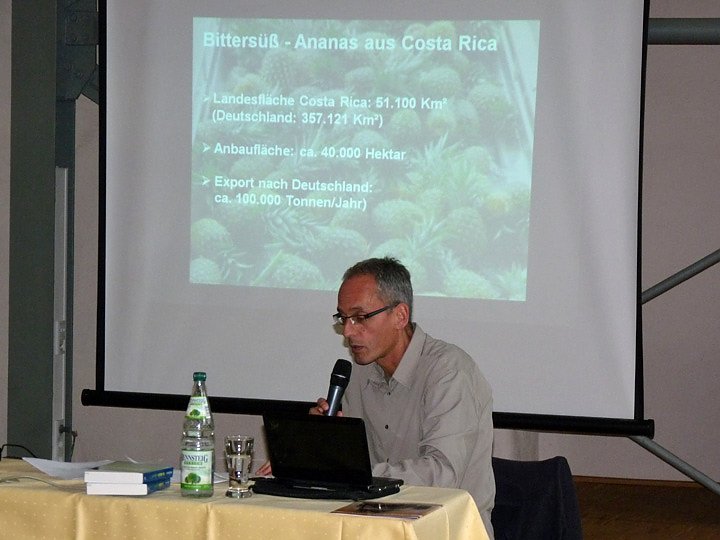 Er präsentiert unter anderem Beispiele mit eigenen Bildern aus Lateinamerika und gibt einen Überblick über neue Entwicklungen im Fairen Handel, zeigte aber auch erschreckende Entwicklungen beim Anbau von Monokulturen, wie am Beispiel Ananas. Um zu verdeutlichen, dass Fairer Handel nur EIN Baustein einer nachhaltigen Lebensweise ist, geht Frank Herrmann zum Schluss seiner Präsentation auch auf die Themen Fairer Tourismus, Faire Textilien, Faire Elektronik und Faire Geldanlagen ein.