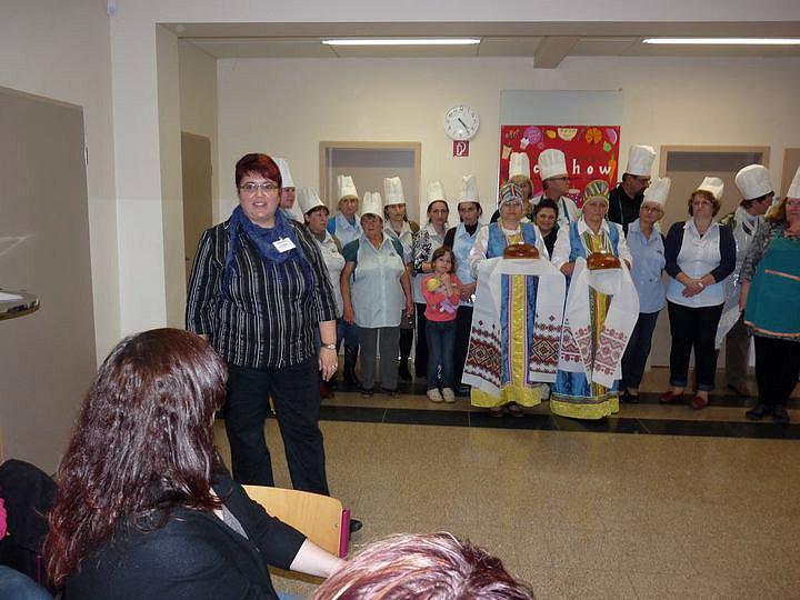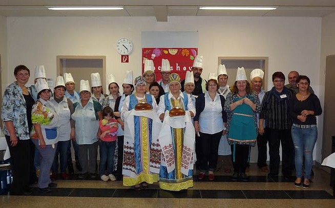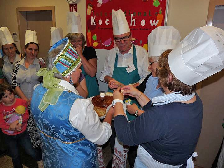 Begrüßt wurden Kochakteure und Gäste nach alter Tradition mit Brot und Salz.Während man drinnen noch brutzelte, sammelten sich draußen schon die Interessenten, anschließend zu testen, was die Prominenz mit tatkräftiger Unterstützung in der dortigen Lehrküche so fabriziert haben. Zur Einstimmung gab es einen Tanz der Migranten. Gekocht wurden Gerichte aus der Ukraine Russland, Turkmenistan, Kasachstan, Tschetschenien und aus Deutschland. Insgesamt sieben Gerichte und ein köstliches Dessert wurden gekocht.