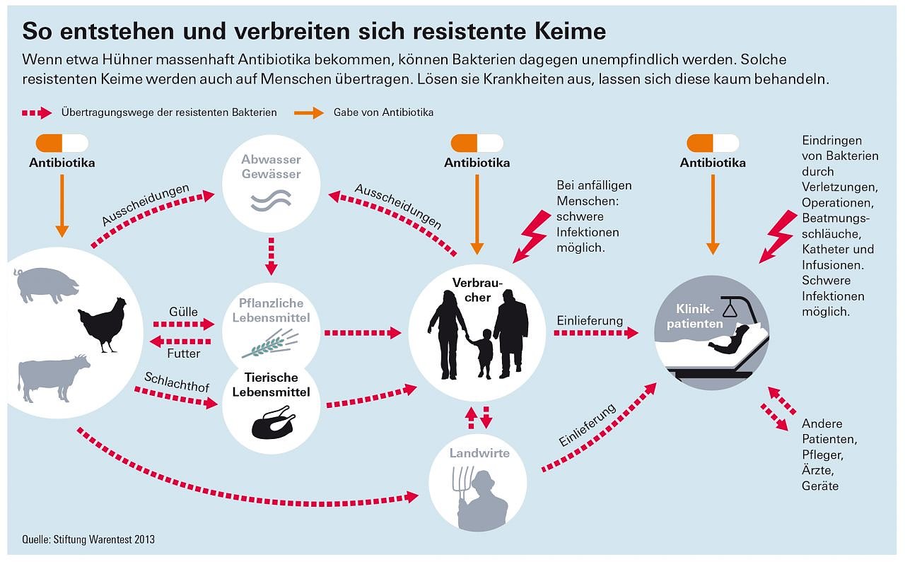 Dafür fand die Stiftung Warentest nur in einem der fünf getesteten Bio-Hähnchenschenkel antibiotikaresistente Bakterien. Eine mögliche Erklärung dafür: Bei Bio-Erzeugnissen ist der Antibiotikaeinsatz stark beschränkt. Dagegen fanden die Tester bei 11 von 15 konventionellen Produkten antibiotikaresistente Keime. Selbst die Hähnchenschenkel, die im Test gut abgeschnitten haben, sind nicht keimfrei. Das wäre biologisch unmöglich. Deshalb gilt: Gut Durchgaren oder –braten tötet Bakterien – auch schädliche und resistente.