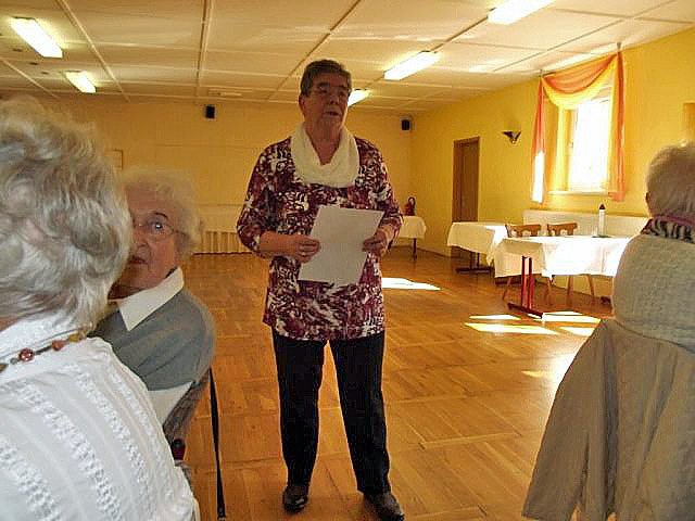 Ja, es hat sich herumgesprochen, dass im WB 4 immer was los ist, sicher auch durch meine Beiträge von unseren Veranstaltungen in der Presse. Nachdem Christa Groß (Foto) alle Gäste begrüßt hatte las Thomas zur Einstimmung und schönes Herbstgedicht von Irmgard Arbecker vor. Anschließend war erst einmal Kaffeetafel angesagt. Hier hatte sich das Juventas Team wieder viel Mühe gegeben und die selbst gebackenen Kuchen mundeten vorzüglich.