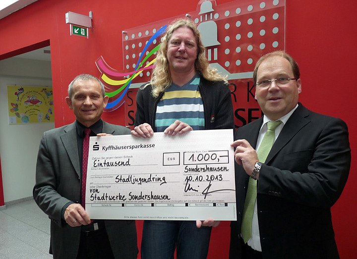 Die Übergabe des Spendenschecks in Höhe von 1.000,00 EUR an den Geschäftsführer des Stadtjugendring Sondershausen e.V., Andreas Gothe (Mitte), erfolgte am späten Vormittag durch die Geschäftsführer der Stadtwerke Sondershausen GmbH, Hans-Christoph Schmidt (re.) und Wilhelm Schreier (li.).
