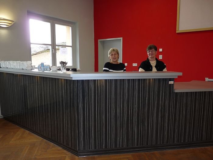 Darüber hinaus verfügt der Saal nunmehr über eine neue Unterhangdecke mit neuer Beleuchtung und eine moderne Thekenanlage.