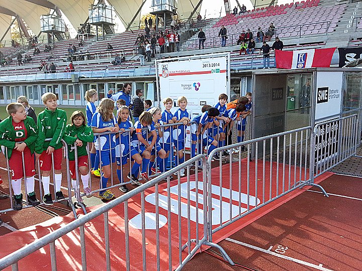 Trainerteam der Eventverantwortliche Uwe Methfessel am Stadioneingang in Empfang und führte uns in die Katakomben des Steigerwaldstadion, welches an diesem Tag mit über 6.000 Zuschauern gut besucht sein sollte. Nachdem sich alle Kinder ihre heimischen Trikots angezogen hatten und über die geschenkten Fanschals freuten ging es dann auch schon in den Stadioninnenraum. Hier wurde mit der zweiten Einlaufmannschaft aus Sülzfeld zuerst darum gelost, welches Team mit den Erfurtern einlaufen durfte. Dieser Sieg ging dank der Spielerin Isabell Landes an die Kurstädter. Danach beobachtete man das Aufwärmtraining, machte viele Fotos und klatschte mit den Rot-Weißen noch mal ab, bevor dann der eigentliche Höhepunkt anstand. Im Kabinengang, wo sich beide Einlaufteams zurecht stellten und auf ihre Begleiter warteten gab es dann eine kleine Überraschung.