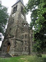 St. Johanneskirche in Bretleben © Dr. Karin Gehrmann/Deutsche Stiftung Denkmalschutz.An der Stelle mehrerer Vorgängerkirchen wurde die neue Johanneskirche zwischen 1895 und 1897 nach Plänen der Architekten Grisebach und Dinklage errichtet. Der steinsichtige Saalbau erhebt sich über einem kreuzförmigen Grundriss und schließt mit einem innen um zwei Stufen erhöhten mehreckigen Chor im Osten und einem westlichen Treppenturm auf quadratischem Grundriss ab. Zwei Anbauten fügte man zwischen Chor und Querhausarmen ein. An der Südseite des Turms, dessen Dach mit einem Schweifhaubenansatz beginnt und in einem Spitzhelm ausläuft, schließt sich ein halbrunder Treppenturm an. Hohe Rundbogenfenster gliedern den Bau und den mehrfach durch Horizontalgesimse gegliederten Turm. Die stuckierte Gewölbedecke als Rabitzkonstruktion mit Kreuzrippen auf Konsolen prägt den Innenraum der Kirche. Die den Westen dominierende Empore ist wie die im Osten stehende Kanzel aus Werkstein gegossen und mit Stuck dekoriert.